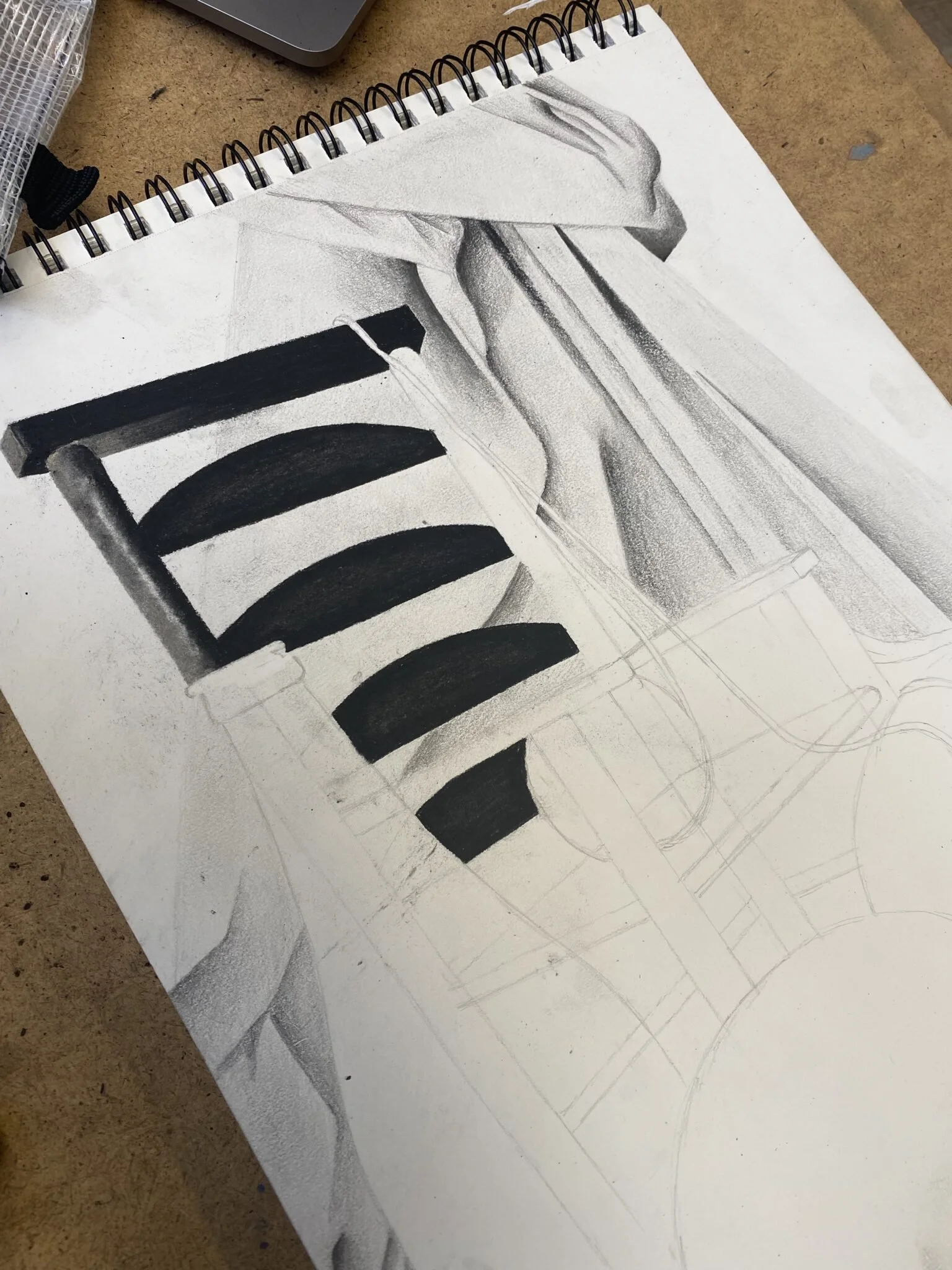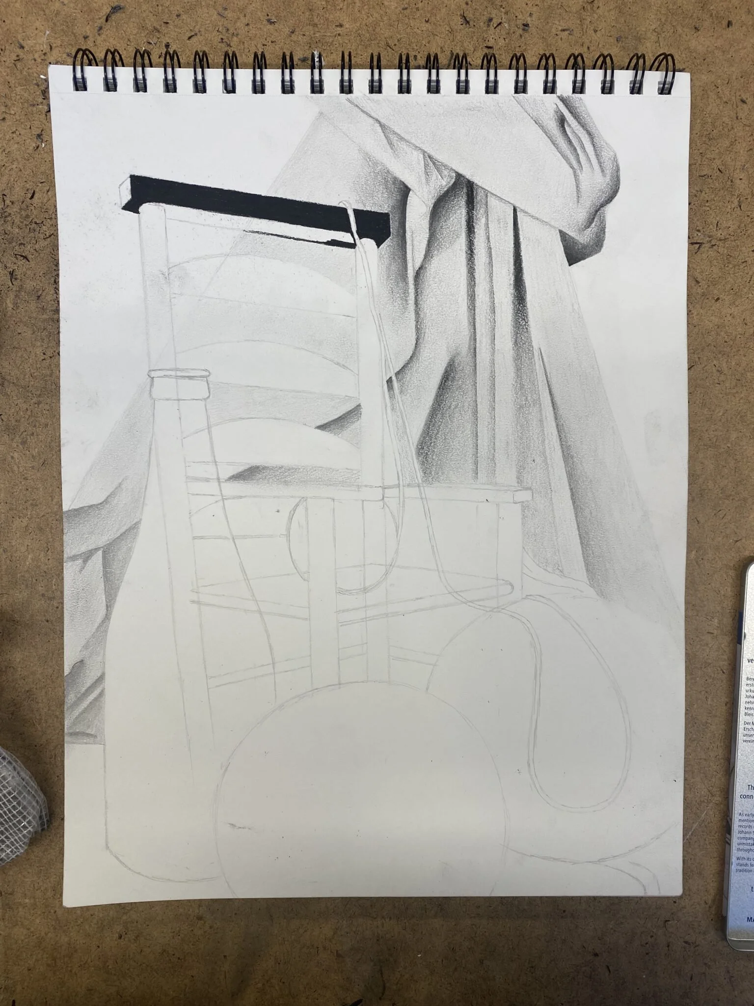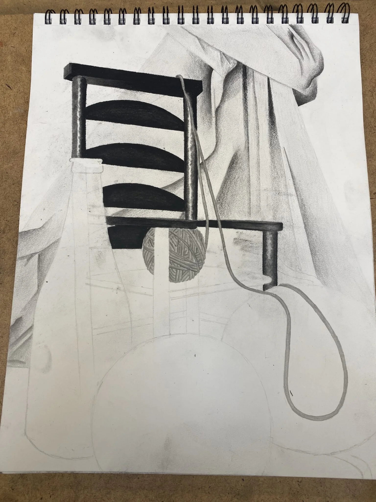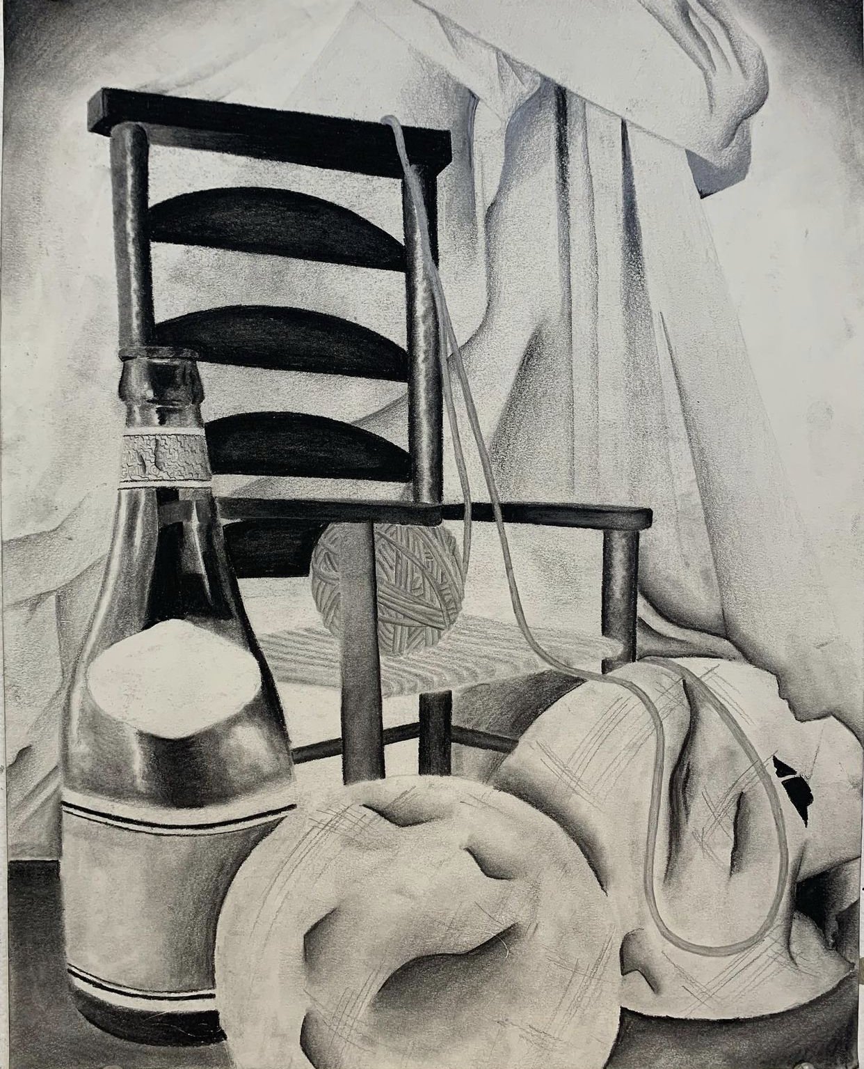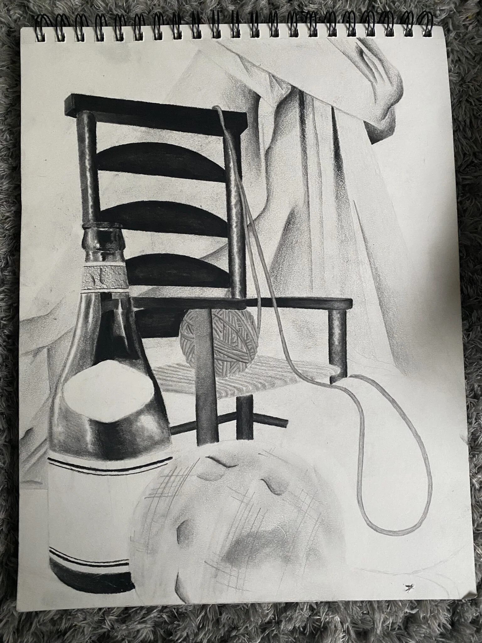 My favorite part to do out of this drawing was the chair. Not only do I love how dark and rich it came out compared to the other items, but I also enjoyed the process. To create the texture and highlights of the chair, I started by outlining each section of the chair with my mars pencil in 6/7B. Closer to the middle of each section I scribbled horizontally and left some white in the center. I then used my blending stomp to blend the charcoal into the mars pencil and the mars pencil into the white space. I was very proud of the end result.