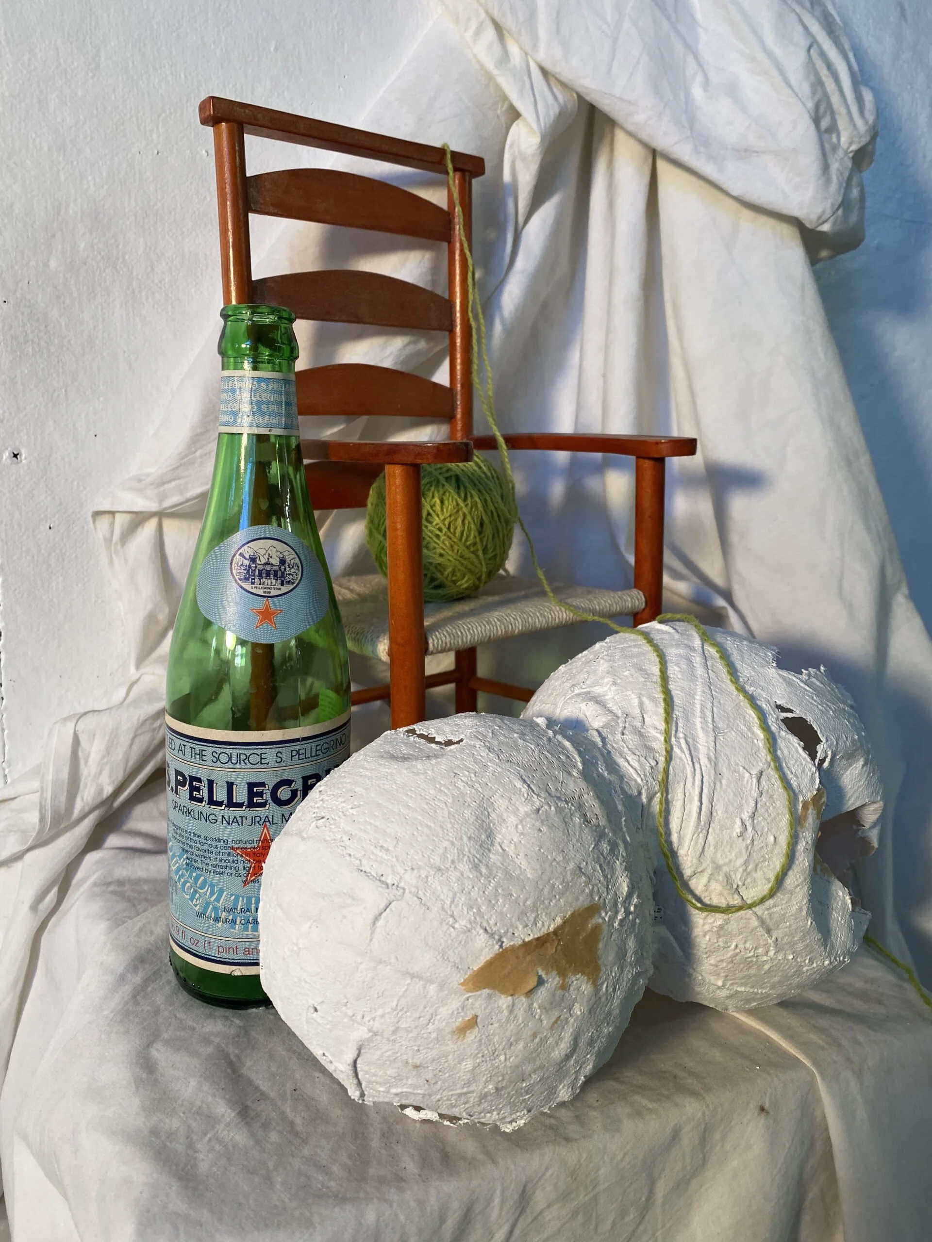 I started building my composition through photographs. I set up my items in front of the cloth backdrop with the light source to the side and was satisfied with the image you see to the right.